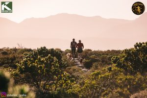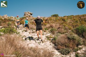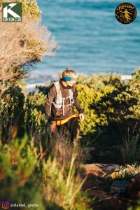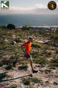 The route starts with an immediate uphill leaving Kommetjie towards Scarborough. After that uphill warmup, the runners leave the tar road and join the Switchbacks trail that zig zags upwards to the Cobra Camp blockhouse. Heading past the Cobra Camp, the trail flattens out and is a runnable single track through the fynbos. At Big Rock, the trail starts the steep descent down to the church where it rejoins the tar road. From there, the runners wind their way through Kommetjie, past Long Beach and kelp fly corner back to KomSurf.