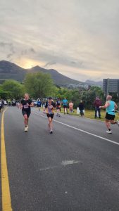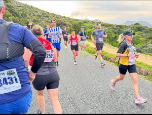 The uphill again, was a slight shock but not unfamiliar. I occupied myself by watching the fast runners coming past me, giving them some encouragement. Running down towards Noordhoek, I saw Adele, a seriously strong Fish Hoek AC runner. She did not look tired at all.