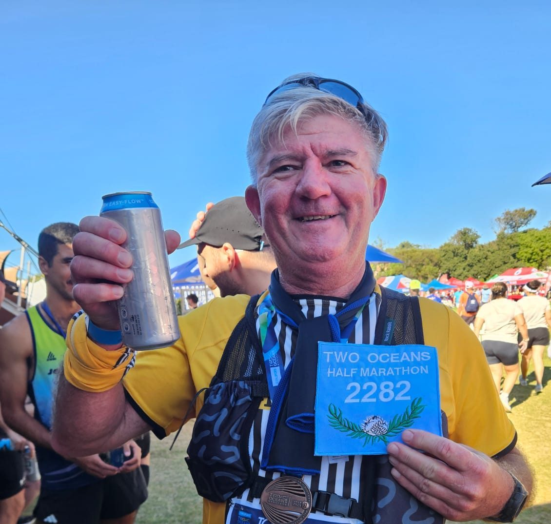 Into the hospitality tent, armband on, a food parcel and choice of any two drinks was on offer. Choices, Black Label to celebrate all the running with Hein and a Castle Lite as per the norm after a run. I was called over by a gentleman that finished his 20th TOM Half and his wife who offered me a seat at their table. Congratulations were exchanged and a cold one enjoyed. Excusing myself I see another runner collapsing just outside the tent with guards etc running to her aid. I decide it’s time to get to the FHAC group waiting in the Bar Tent (obviously). At least if anything goes wrong with me, I am amongst family. I managed to trot most of the way there, even down the steps, clearly the adrenalin and excitement numbed the pain in the legs.